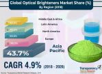 In terms of revenue, the global optical brighteners market is projected to expand at a CAGR of 4.9% from 2018 to 2026, according to a new research report titled Optical Brighteners Market Global Industry Analysis, Value, Share, Growth, Trends, and Forecast, 20182026 published by Transparency Market Research (TMR) In terms of value, the global optical brighteners market is expected to reach US$ 2,036 Mn by 2026. The market is driven by the rise in demand for optical brighteners in detergent products. The optical brighteners market in Asia Pacific is estimated to expand at a CAGR of 5.4% during the forecast period, owing to the rapid increase in demand for optical brighteners in the cleaning sector in the region. Based on chemical, the stilbene segment held major share of the global optical brighteners market in 2017. However, the diphenyl pyrazoline segment is anticipated to expand significantly from 2018 to 2026.